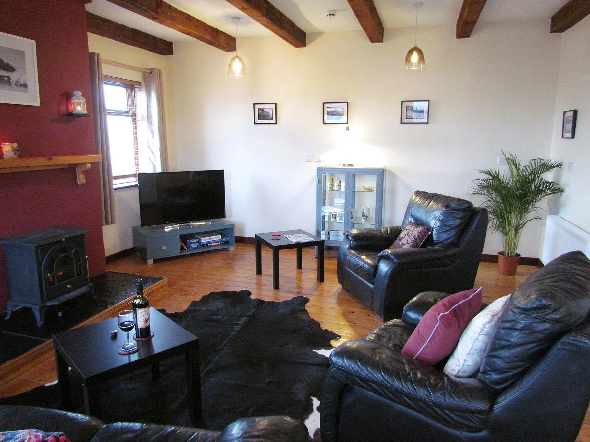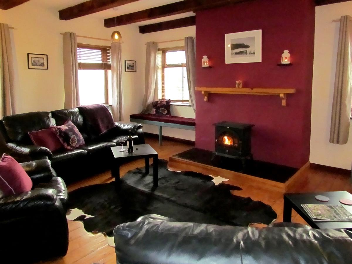 Grosses Wohnzimmer mit Kaminofen und 50" Smart-TV sowie Fenstersitz